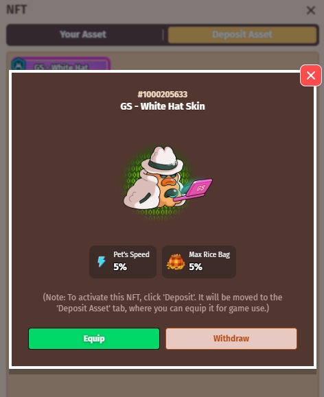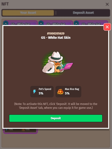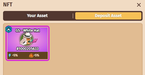 Once the NFT Skin is deposited to the game, it will appear in the 'Deposit Asset' tab for your use.
