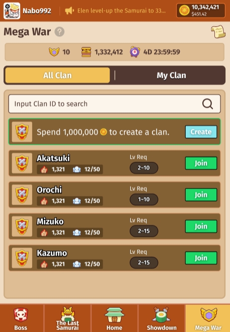 As Clan Lord, you can join Megawar to compete for the strongest Clan in Rice Kingdom.